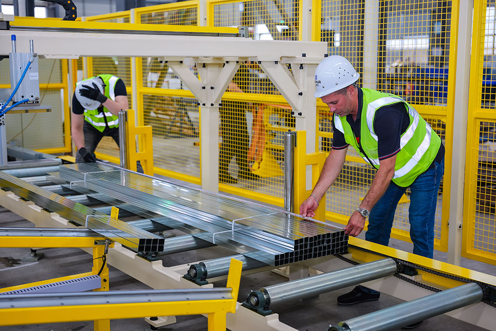 Velocidad de giro: 120 metros por minuto. Gira el perfil de metal y lo encaja.