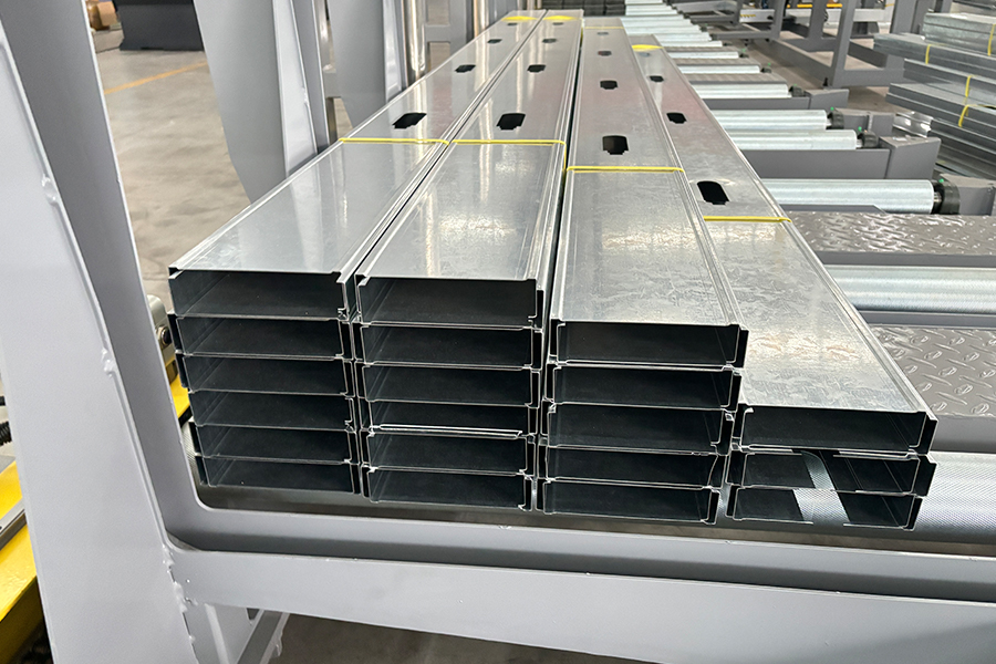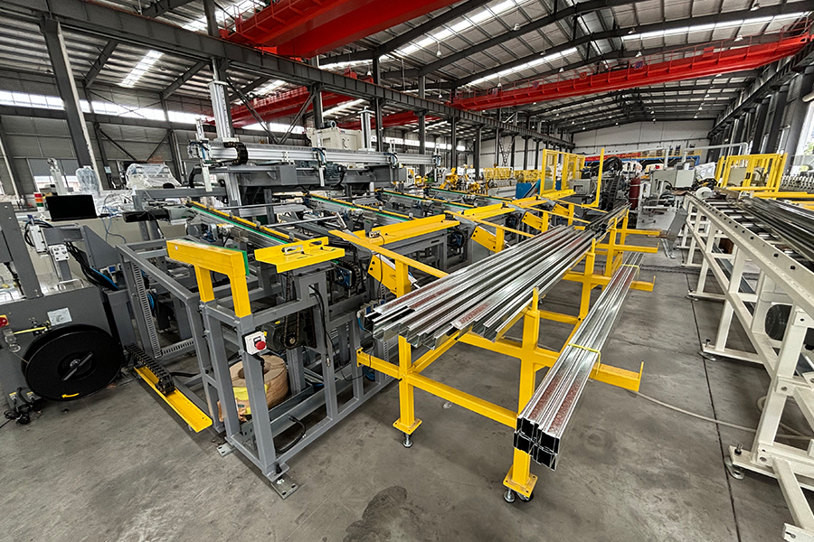 Hogar / Productos / Máquina formadora de rollos de perfiles de paneles de yeso / Máquina perfiladora de espesor de altura y ancho de perno y pista con cambio automático de ancho y espesor con sistema de embalaje automático